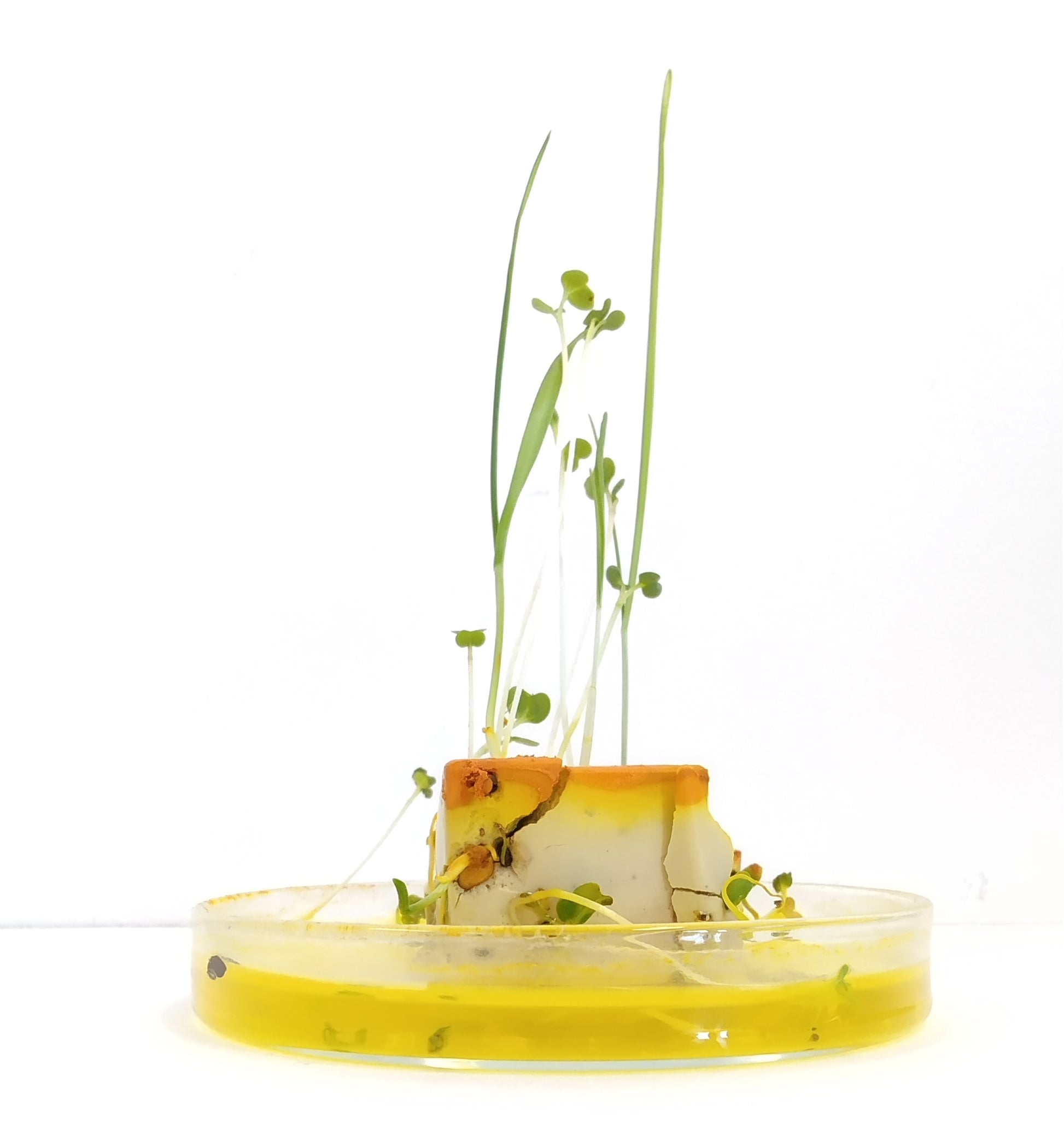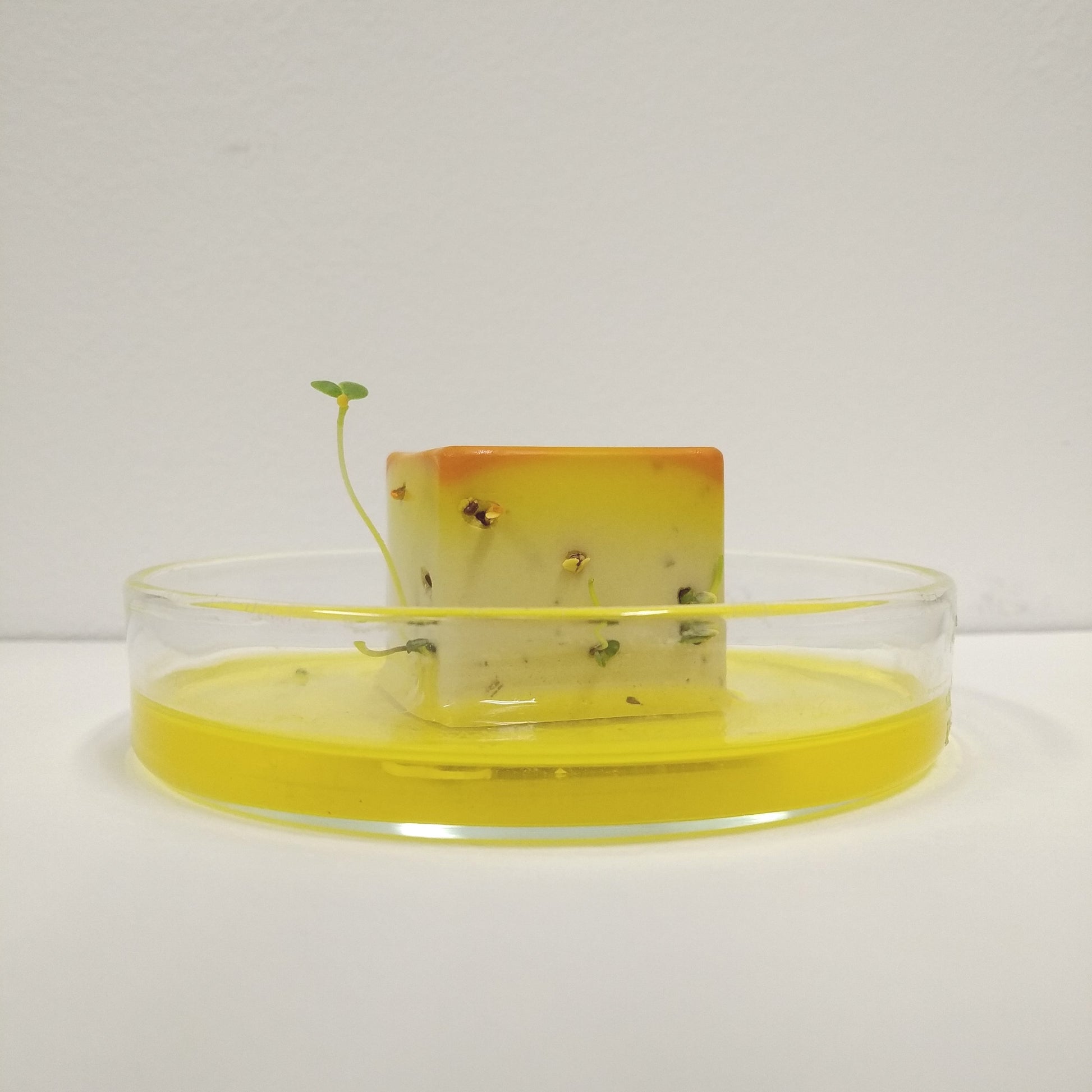 Dit gele blokje komt in een mooi kartonnen doosje met petrischaaltje. Geef het blokje elke dag een beetje water en het kunstwerkje gaat leven.